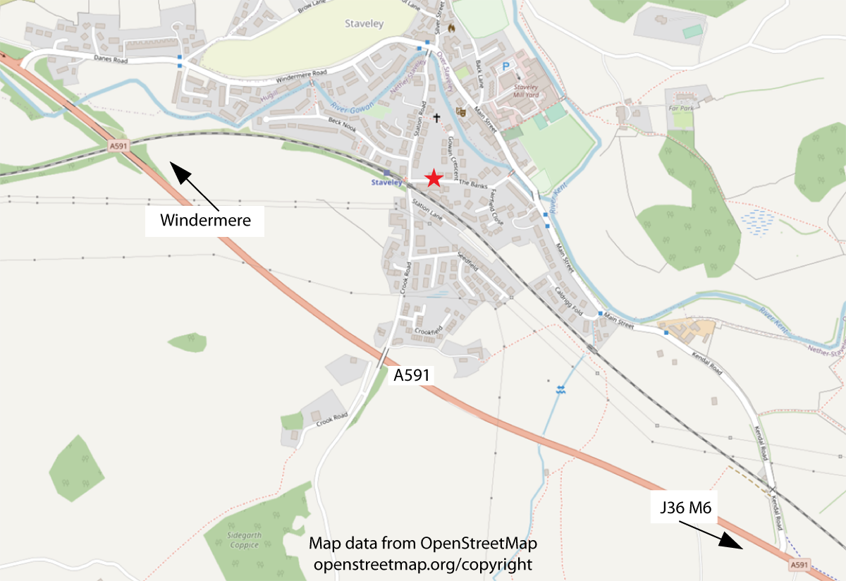 Staveley is easily reached by car or train. The village sits beside the A591, reached from Junction 36 on the M6. The road runs northwest, bypassing Kendal (4 miles from Staveley) and Staveley itself, making the village a quiet oasis, but with easy connections to the nearest towns of Windermere and Kendal.