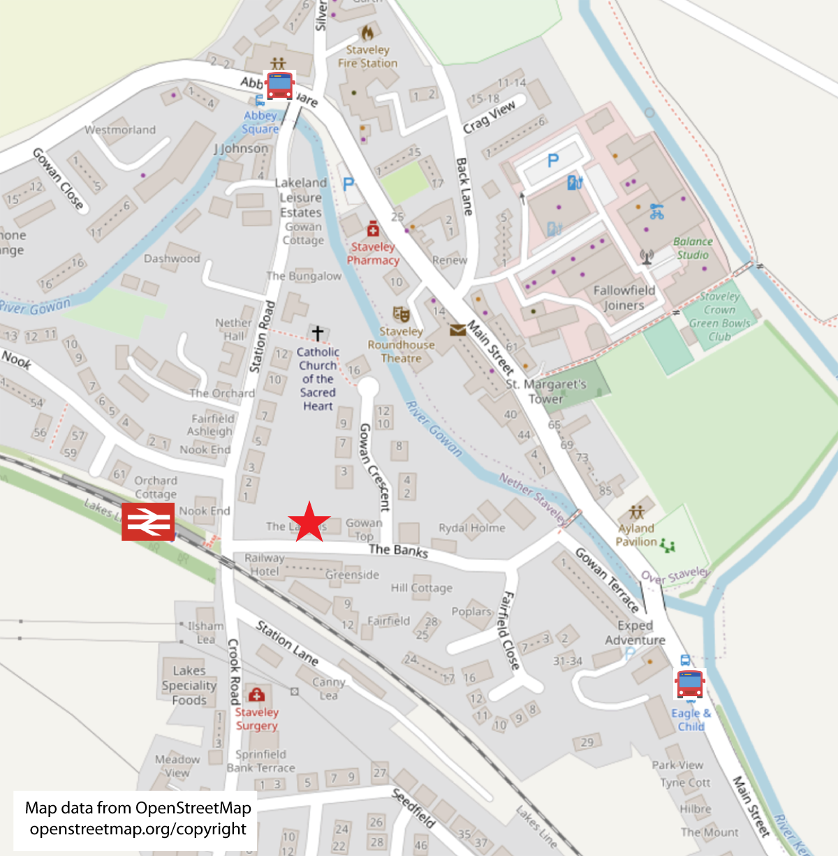 By train, the Oxenholme to Windermere line stops at Staveley. Once out of the station, The Banks is straight ahead with ‘Rayburn’ on your left. The train timetable can be found here